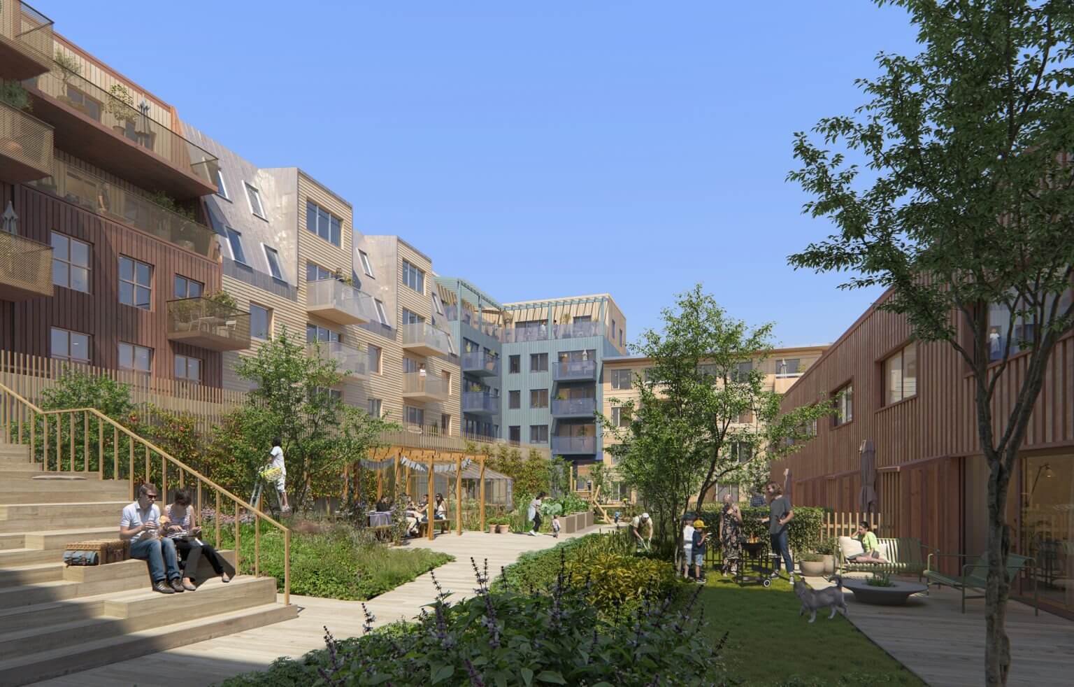 A modern complex of 30 eco-friendly houses along the riverside, featuring shared green spaces and a community boathouse